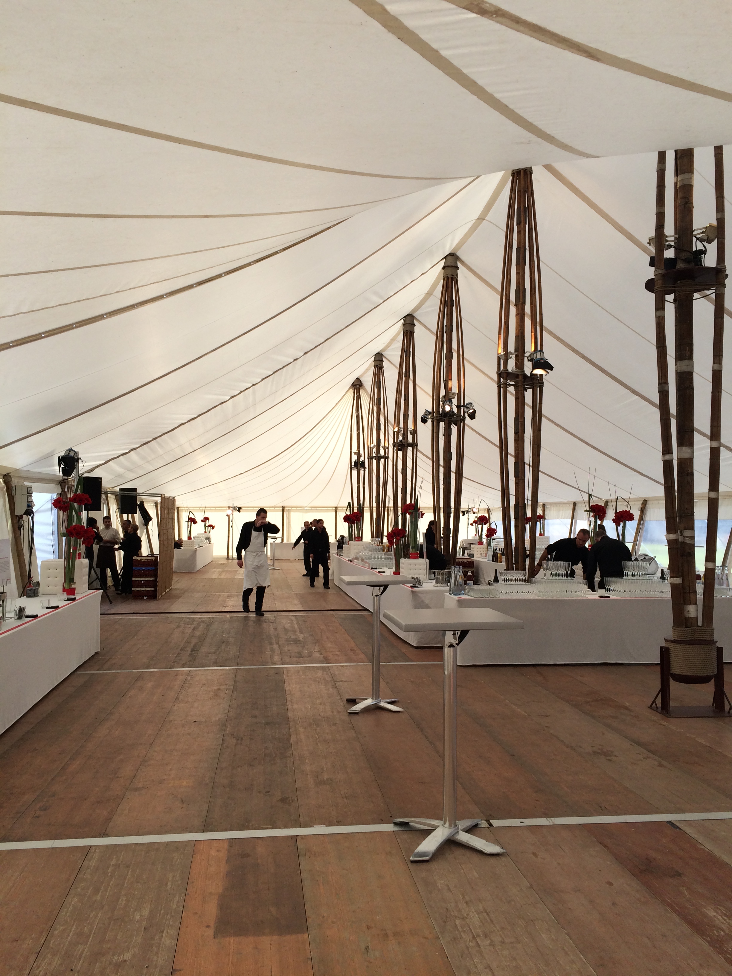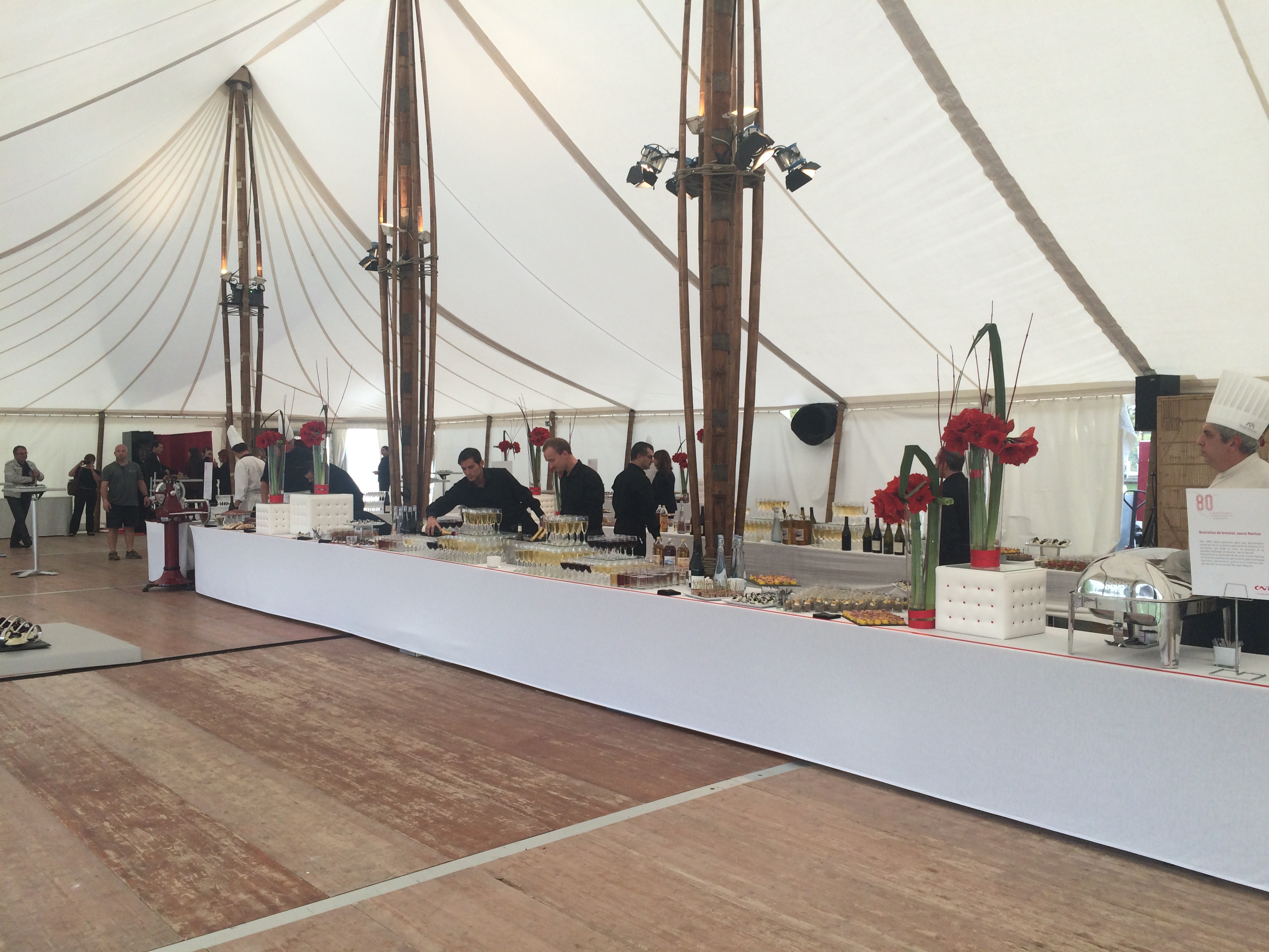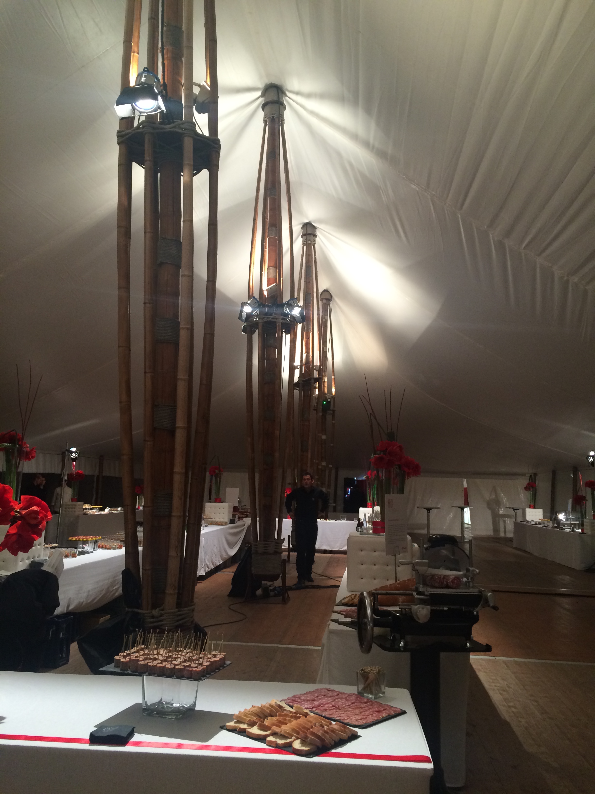 Les participants ont été accueillis dans une chapiteau de 450m² (15x30m) donnant sur la structure conférences et spectacles de 875m² (25x35m). Cette dernière était équipée de bardage coque et une pointe de pignon cristal sur-mesure : un espace isolé, chauffé et offrant une vue imprenable sur le fleuve. Plusieurs tentes ont également été montées en périphérie, notamment le chapiteau bambou de 600m² (15x40m) dédié au cocktail.