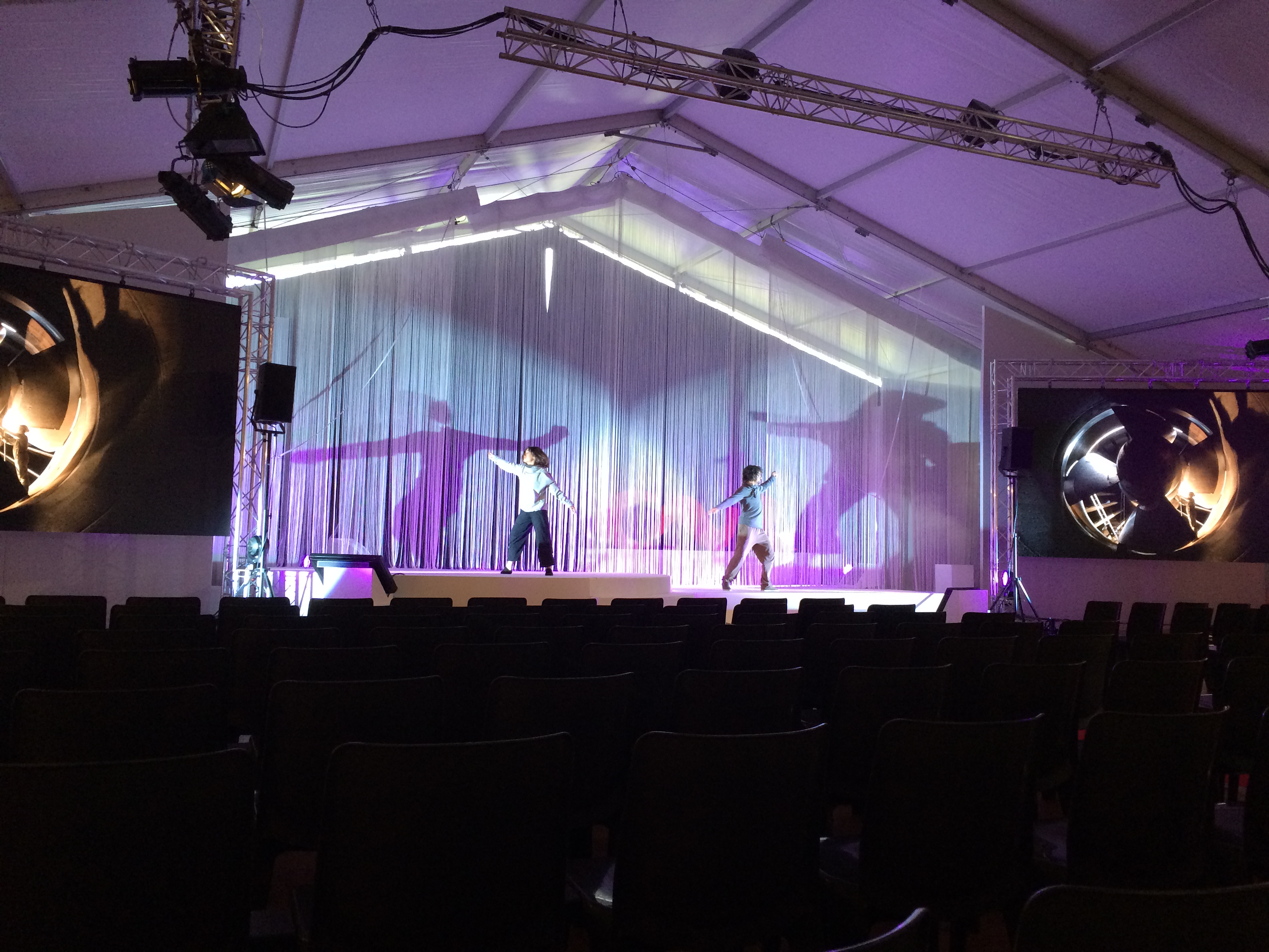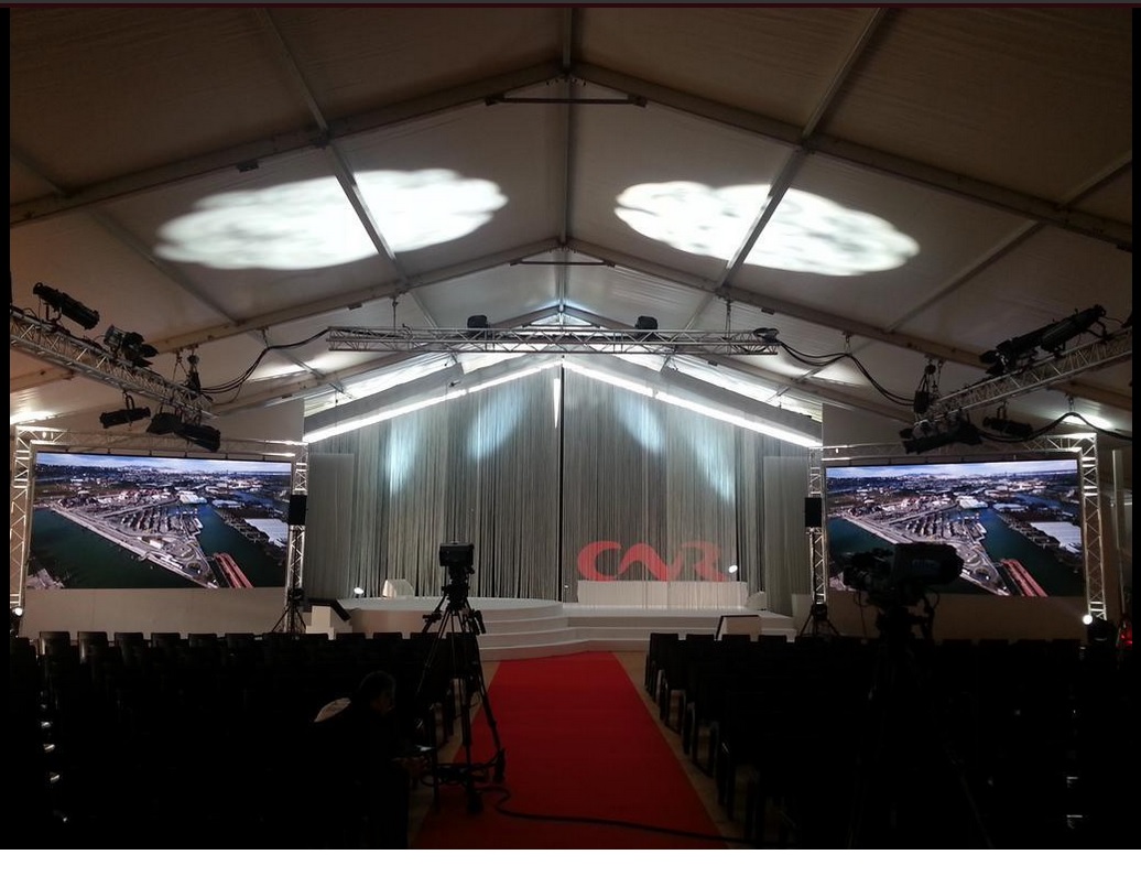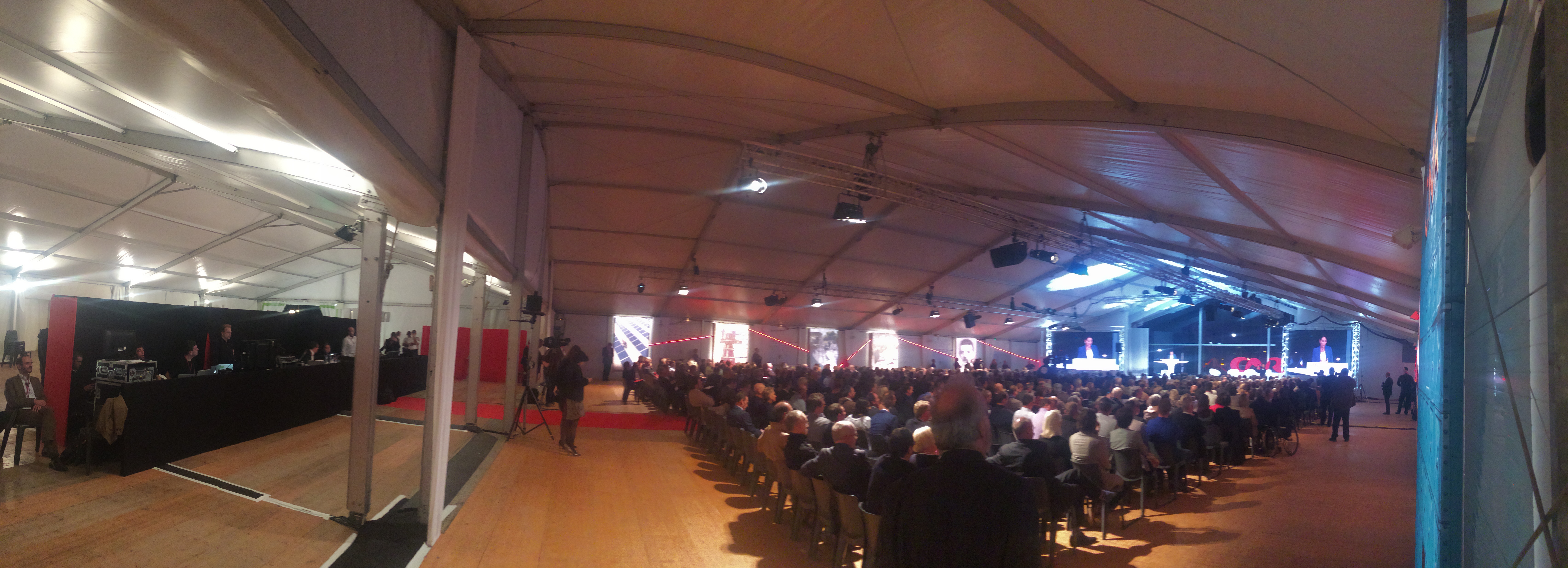 Les participants ont été accueillis dans une chapiteau de 450m² (15x30m) donnant sur la structure conférences et spectacles de 875m² (25x35m). Cette dernière était équipée de bardage coque et une pointe de pignon cristal sur-mesure : un espace isolé, chauffé et offrant une vue imprenable sur le fleuve. Plusieurs tentes ont également été montées en périphérie, notamment le chapiteau bambou de 600m² (15x40m) dédié au cocktail.